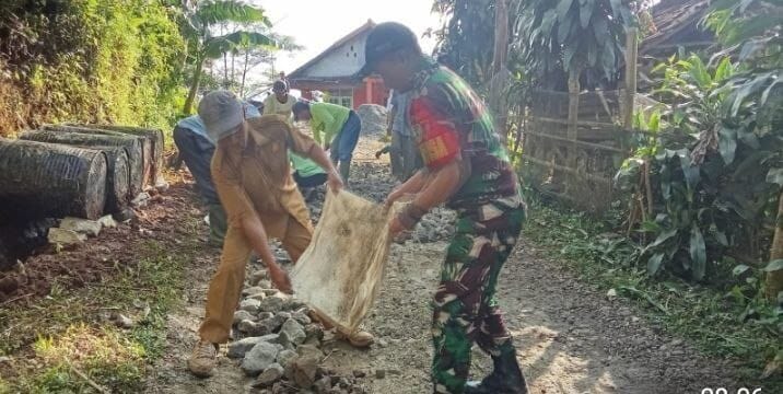 Sukabumi – Babinsa Desa Cihamerang Koramil 2205/Kalapanunggal, Sertu M. Suyatmin, melaksanakan kegiatan pendampingan karya bakti pengaspalan jalan lingkungan (Jaling) bersama warga masyarakat di Kampung Pasir Makam, Desa Cihamerang, Kecamatan Kabandungan, Kabupaten Sukabumi.