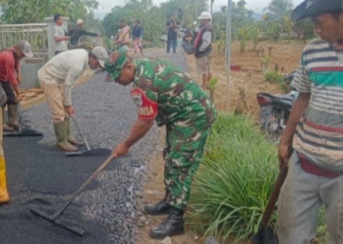 Parakansalak — Babinsa Koramil 2206/Parakansalak, Serda Andri Anis, melaksanakan kegiatan karya bakti (Karbak) perbaikan jalan bersama warga masyarakat di Desa Sukakersa, Kecamatan Parakansalak, Kabupaten Sukabumi.
