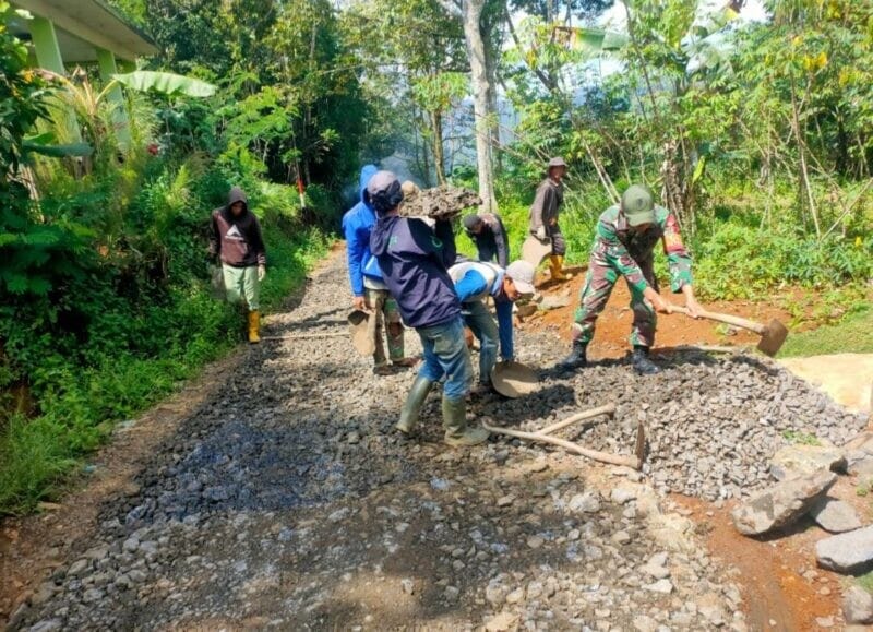 Babinsa Koramil 2209/Lengkong Laksanakan Karya Bakti Perkerasan Jalan Bersama Warga