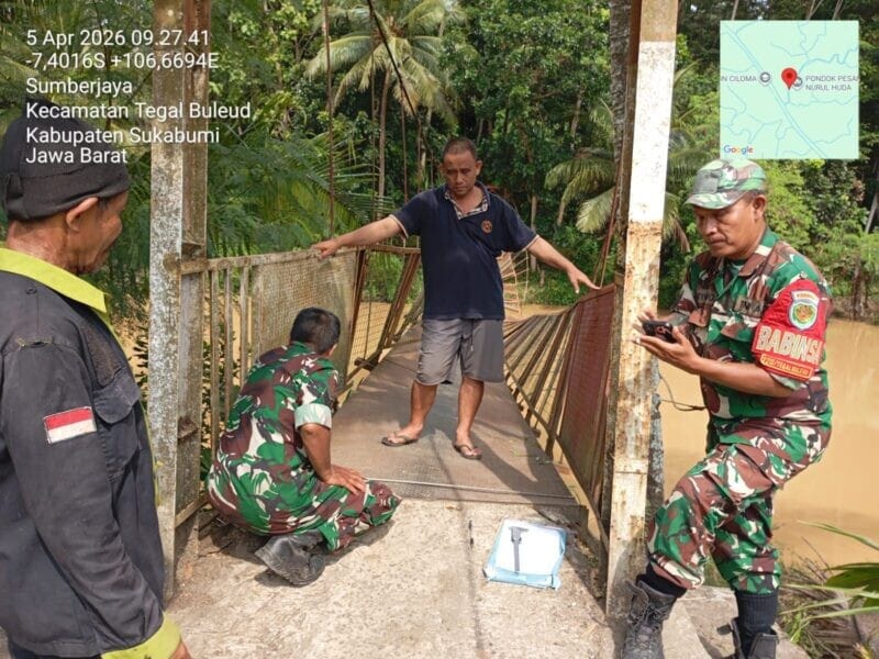 Tegalbuleud, – Babinsa Koramil 2212/Tegalbuleud, Serma Wartono, melaksanakan pendampingan kegiatan survei jembatan gantung yang mengalami kerusakan akibat seling putus di Kampung Lingkungsari, Desa Sumberjaya, Kecamatan Tegalbuleud, Kabupaten Sukabumi, Minggu (05/04/2026).