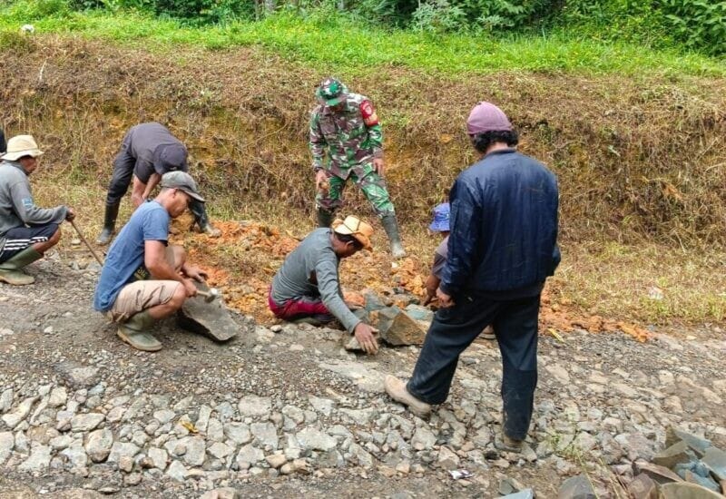 Sukabumi – Babinsa Desa Ciemas Koramil 2215/Ciemas, Sertu Hadin, melaksanakan kegiatan bakti bersama masyarakat dalam pembangunan jalan di Kampung Cikidang, Desa Ciemas, Kecamatan Ciemas, Kabupaten Sukabumi.