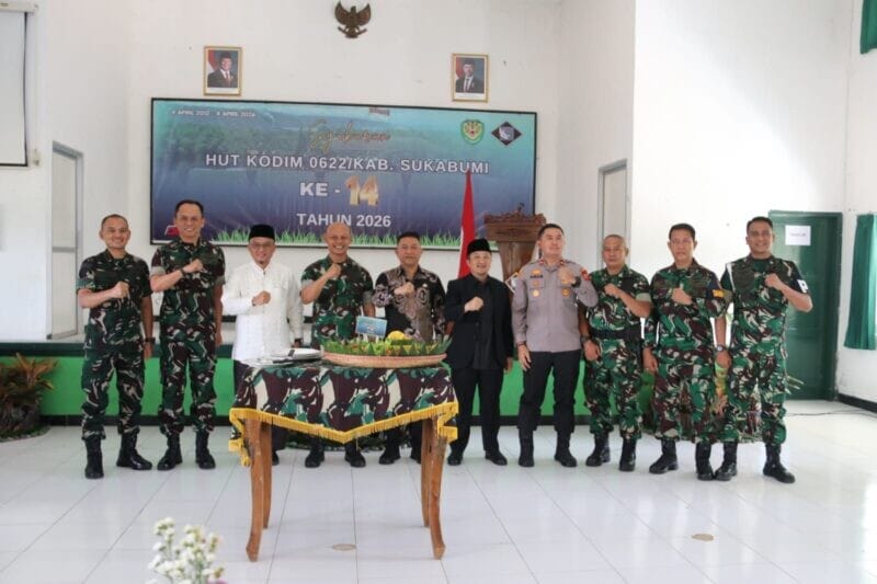SUKABUMI – Kodim 0622/Kabupaten Sukabumi menggelar acara syukuran dalam rangka memperingati Hari Ulang Tahun (HUT) ke-14 Kodim 0622/Kabupaten Sukabumi yang jatuh pada 4 April 2026. Kegiatan tersebut berlangsung di Aula Makodim 0622/Kabupaten Sukabumi, Palabuhanratu, Jumat (10/4/2026).