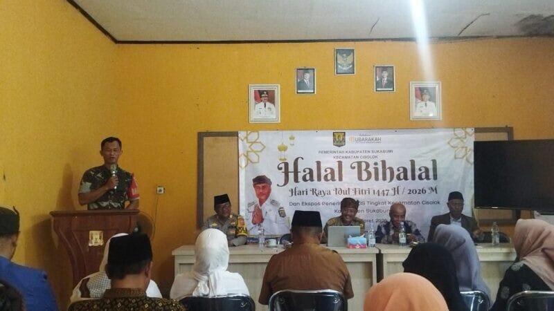 Cisolok, — Danramil 2201/Cisolok Kapten Inf Rohyadi menghadiri kegiatan Halal Bihalal Hari Raya Idul Fitri 1447 H yang dirangkaikan dengan ekspos penerimaan Zakat, Infaq, dan Shodaqoh (ZIS) tingkat Kecamatan Cisolok. Kegiatan tersebut berlangsung di Aula Kecamatan Cisolok, Selasa (31/03/2026) mulai pukul 09.00 WIB hingga selesai.