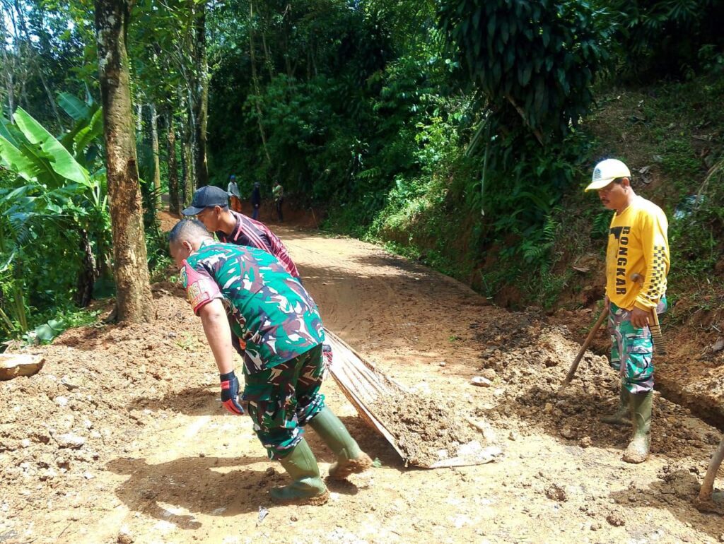 BABINSA DESA CIRENDANG KOPTU PARULIAN SIHOTANG ANGGOTA KOARAMIL 2201/CISOLOK BERSAMA WARGA GOTONG ROYONG BERSIHKAN MATERIAL LONGSOR DI KAMPUNG CISEER, CISOLOK